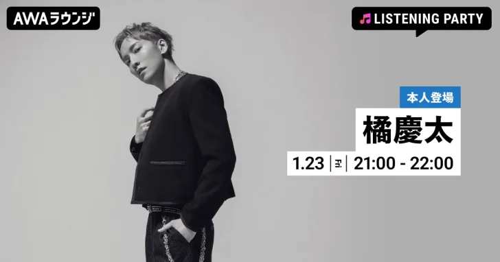 サブスクリプション型(定額制)音楽ストリーミングサービス「AWA(アワ)」は、2026年1月23日(金) 21:00~22:00にて、無料で誰でも参加できるオンライン空間「ラウンジ」で、橘慶太が音声とチャットで登場するリスニングパーティーを開催します。