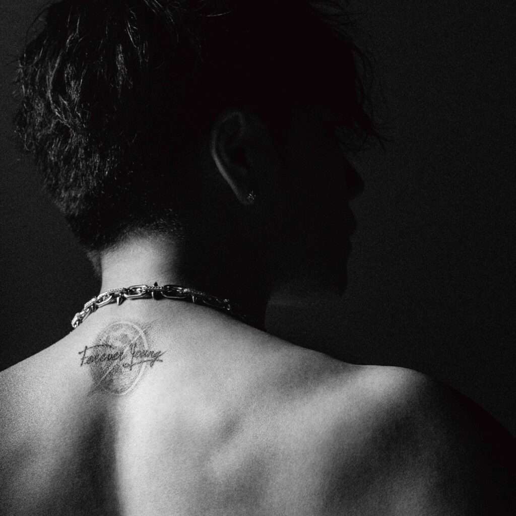 黒を基調としたミニマルな世界の中に、黒のファーコートのØMIが圧倒的なオーラで佇み、「揺るぎない唯一無二の存在感」を感じさせる作品に仕上がっている。