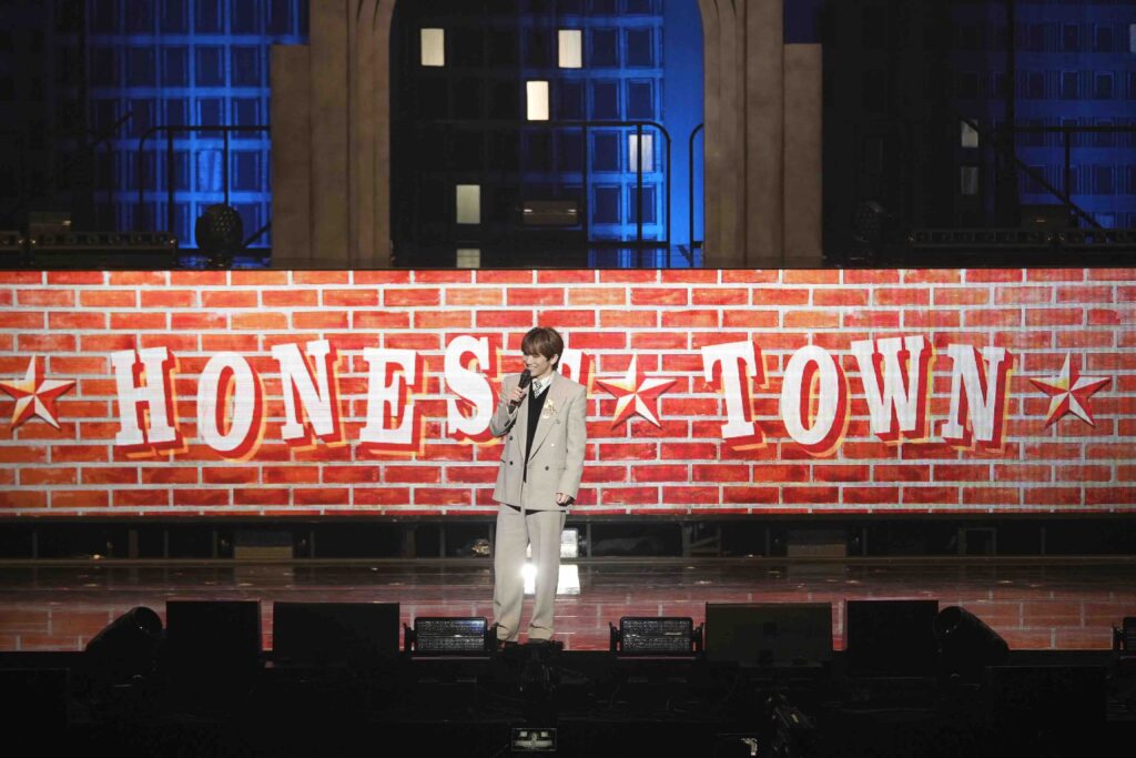 定刻を少し過ぎた頃、大画面にHONEST TOWNのアニメーションが映し出される。どうやら町民が集う広場に、新町長がやってくるらしい。オープニング映像に期待を煽られていると、ついにNAOTOが登場。