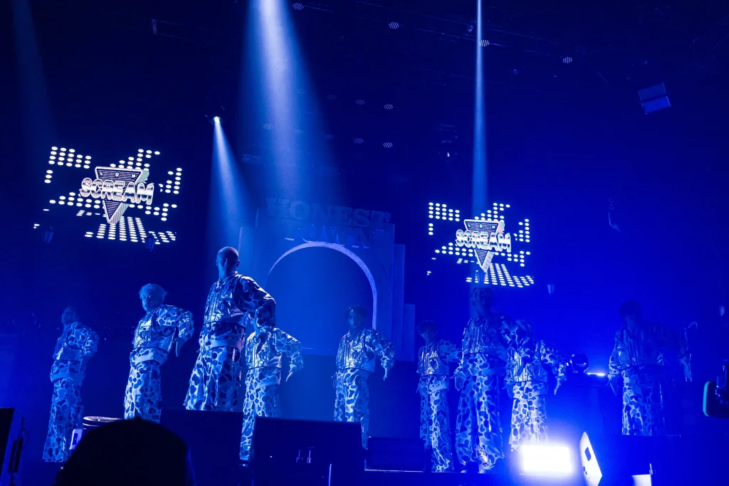 そこに現れたのは、ツアーファイナルのゲストである松井、砂田、JIMMY、小波津。後輩から受け取った決意をマイクに乗せて、LDH SCREAMのチームタイトル曲「SCREEEAM feat. HONEST BOYZ®, RIKI, MASAHIRO, JIMMY, KOKORO」(LDH SCREAM)を熱唱。「叫べ 俺らは誰だ?」「SCREEEAM!」のコール&レスポンスが充満した。