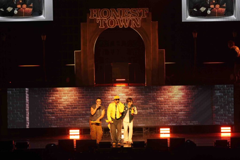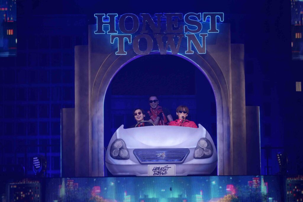 そんなメドレーパートには、「SEVEN!」コールで盛り上がった「オネストセブン」や、SWAYのソロ曲「くだらねぇ feat.Ry-lax,SIMON」も。ゆるめの助走をつけてから一気に駆け出した本編ラストは、今やHONEST BOYZ®のライブに欠かせない「要!」。町民が一丸となり、グッズの“要!手袋”を付けた手を突き上げる様子は圧巻だった。