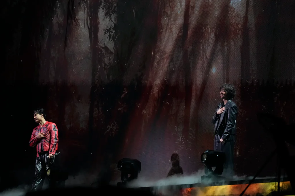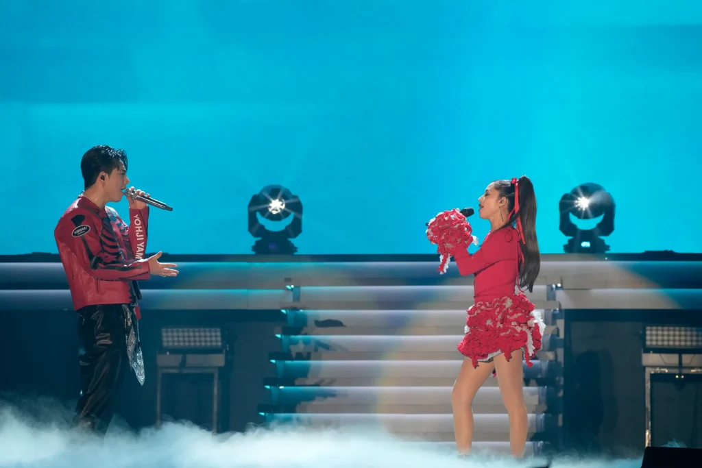 ステージの階段に座りながら「One Last Time feat. BENI」をØMIが歌うと、真っ赤な衣装に身を包んだBENIがサプライズ登場。透き通るように重なる2人の歌声で魅了した。