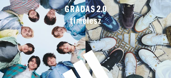 その足元には、どんな時代も色褪せることのない「GRADAS 2.0」が寄り添います。timeleszメンバーそれぞれが履いているGRADAS 2.0に合わせたスタイリングにも注目です。